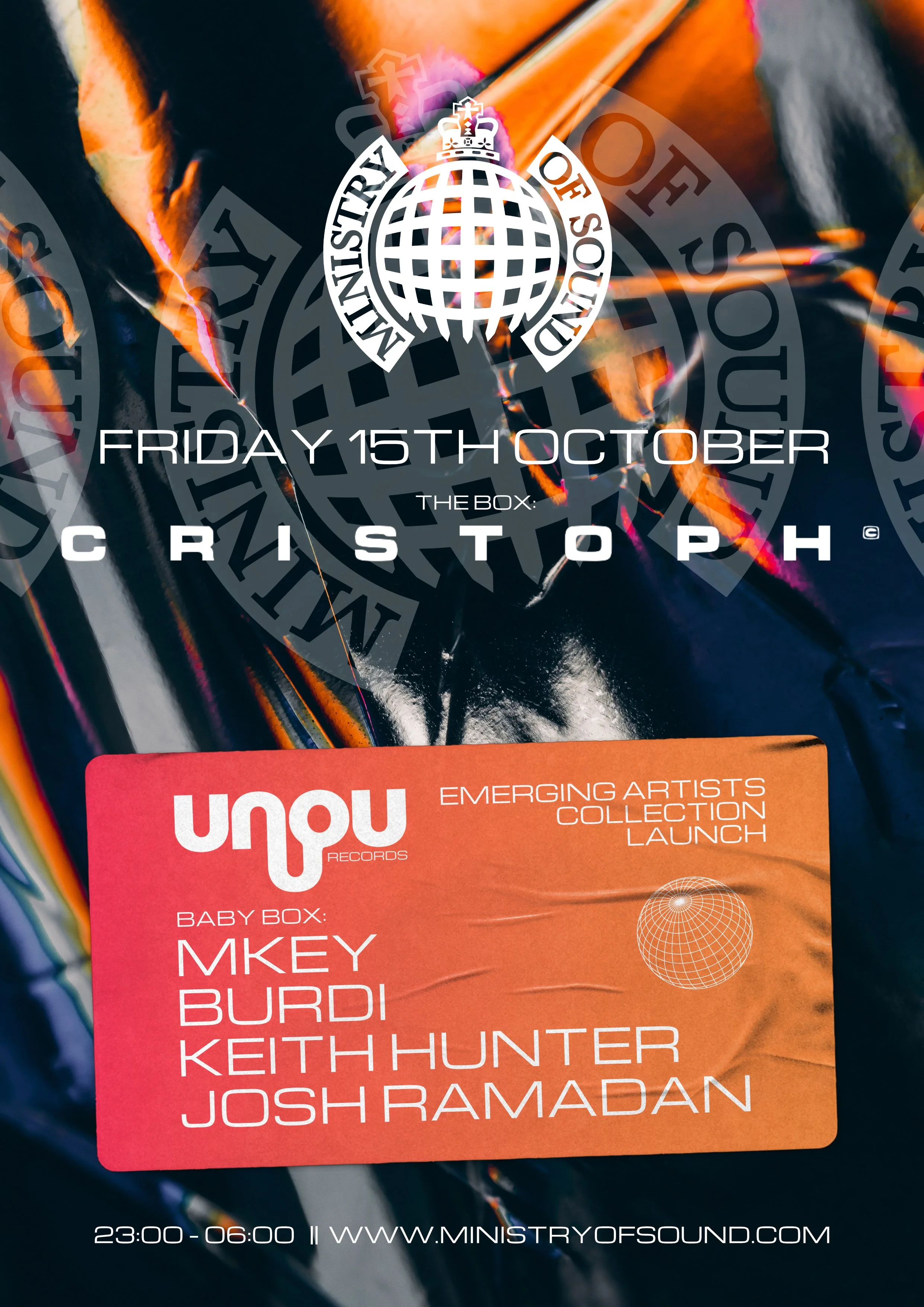 To celebrate the launch of our Emerging Artists Collection which is on pre order from the 8th October, we join forces with Ministry of Sound and host the Baby Box for a night of emerging talent on the label. With a stellar line up in the main room including a headline show from Cristoph, this is one night you're not going to want to miss.